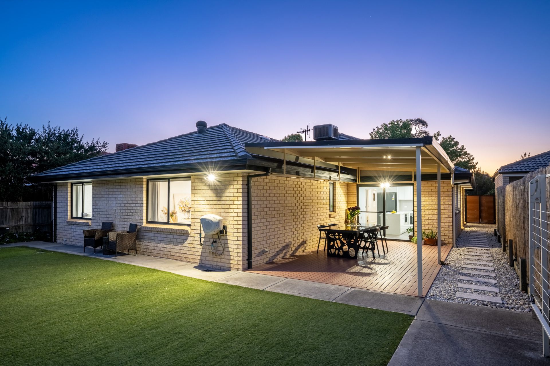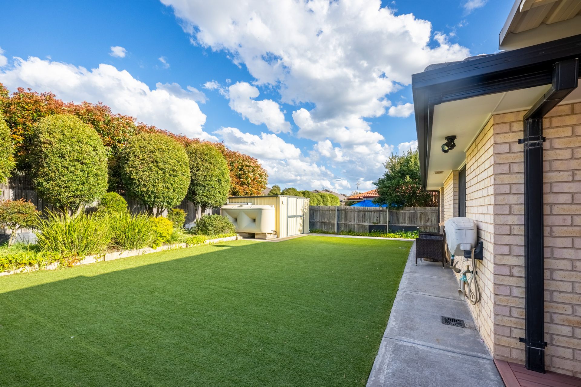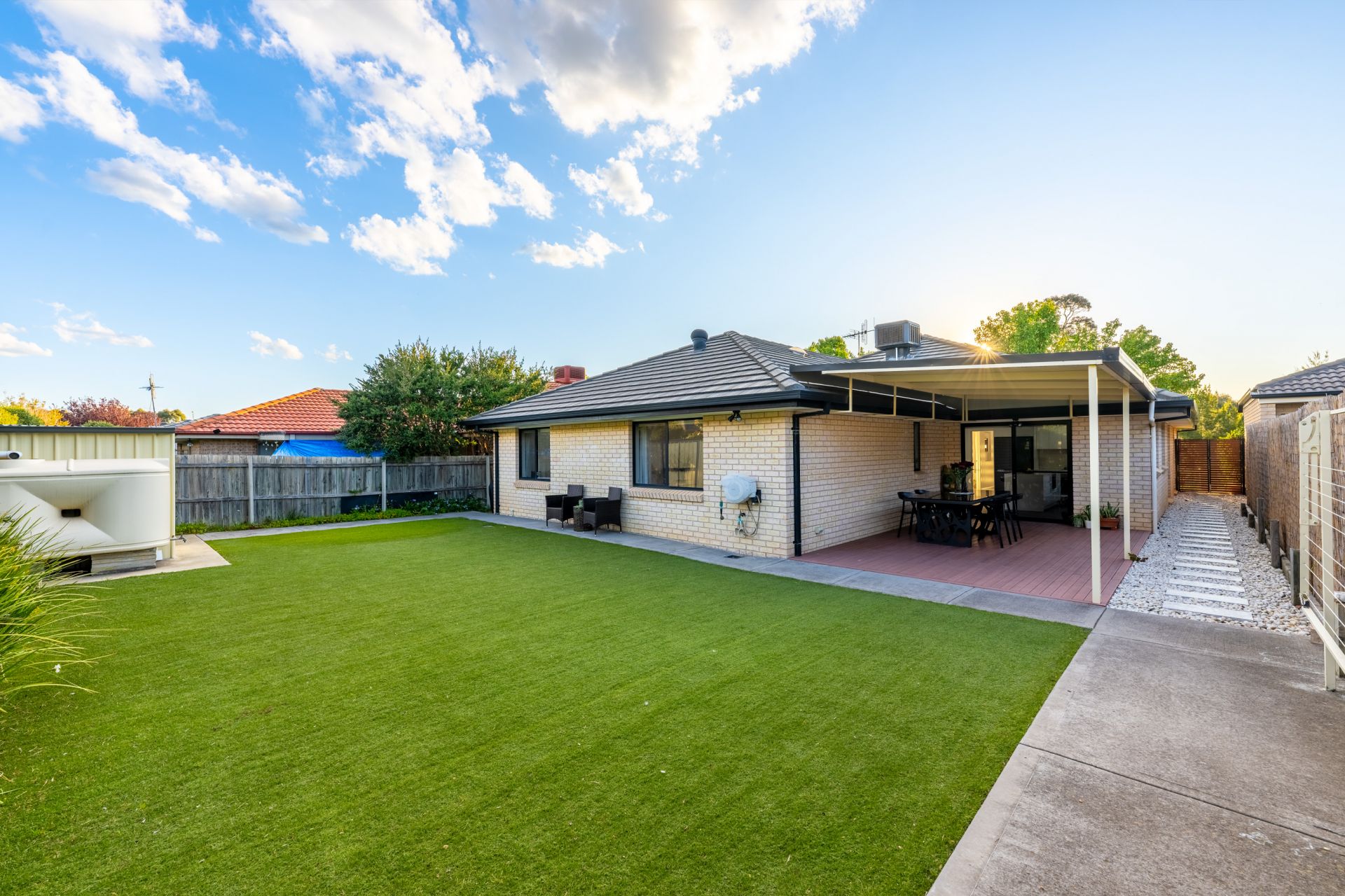 The property includes a 3.1m x 3m work shed, outdoor artificial grass, a footpath, and a 5000L garden water tank. Enjoy outdoor living with a covered pergola and deck, while modern downlights and three skylights fill the space with natural light.