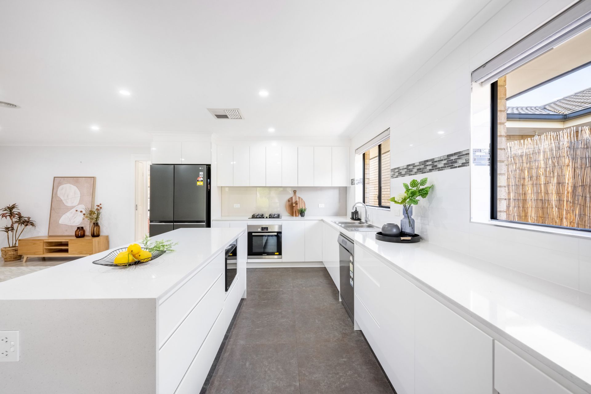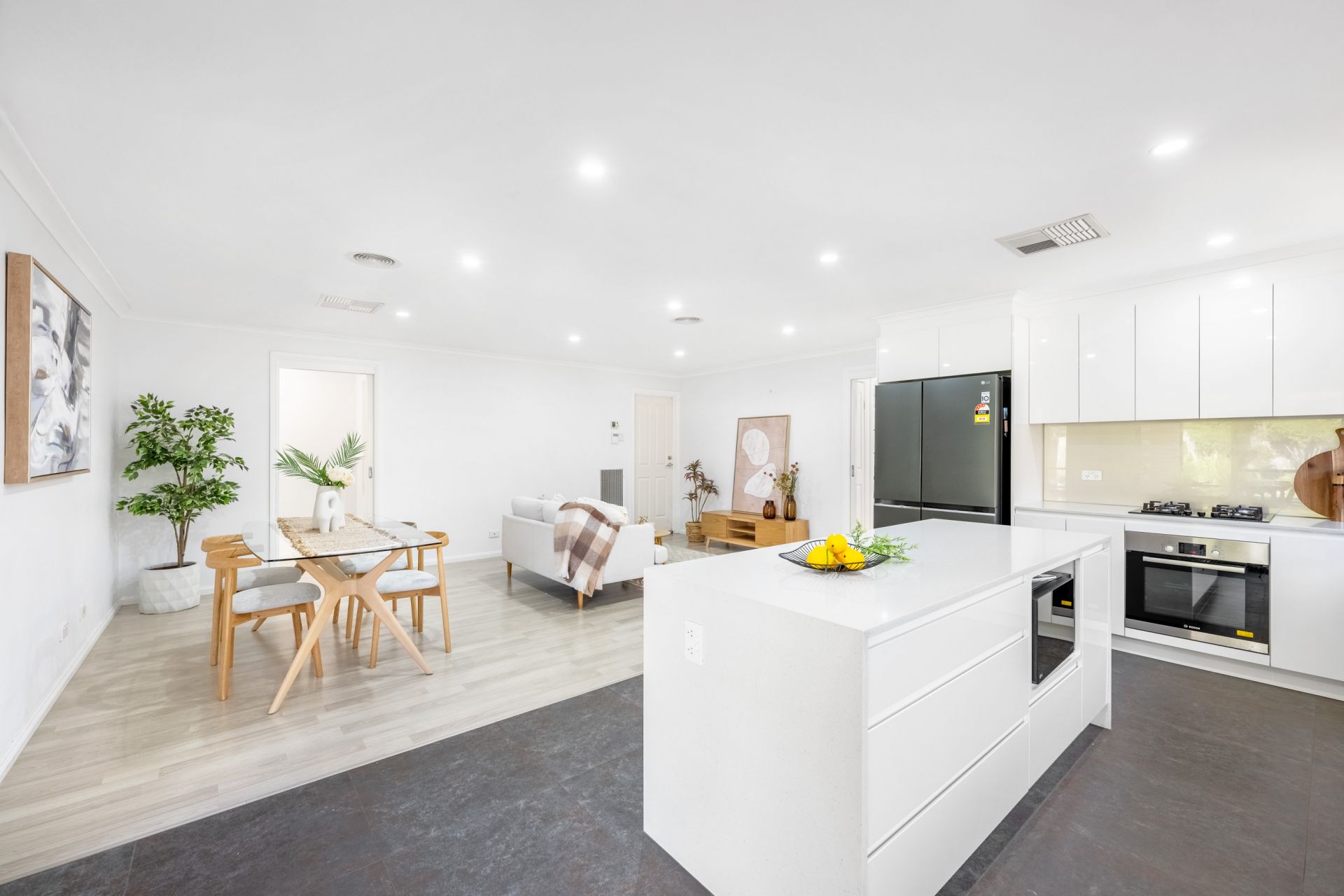 The fully renovated kitchen is equipped with a Bosch gas ceramic glass cooktop, Bosch oven, Samsung dishwasher, white high-gloss cabinetry with soft-close drawers, and a spacious 2100x800mm stone island benchtop, providing a sleek and functional cooking space.
