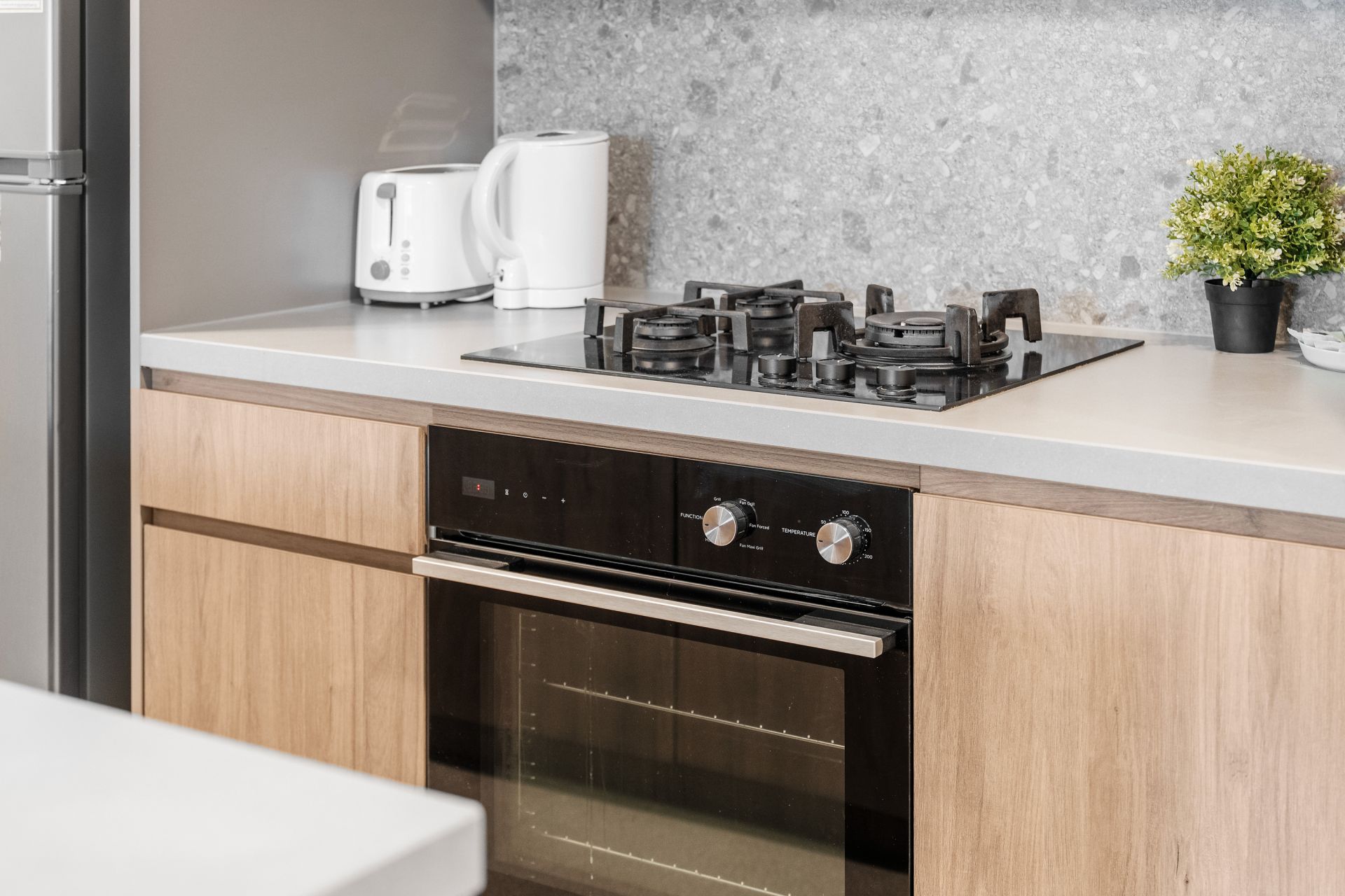 * Designer kitchen with stone benchtops, Fisher & Paykel appliances, soft-close cabinetry, gas cooktop with externally ducted rangehood, and ample storage