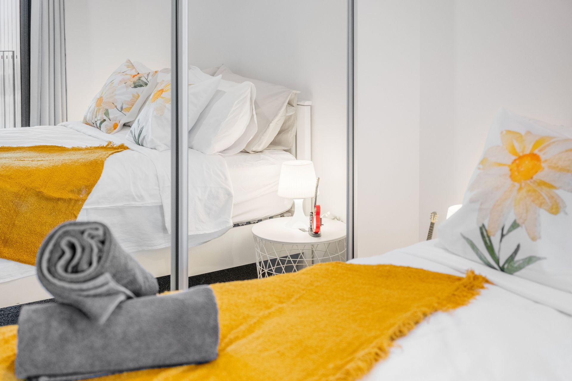 * Spacious bedroom with mirrored built-in robes, roller blinds, and balcony access