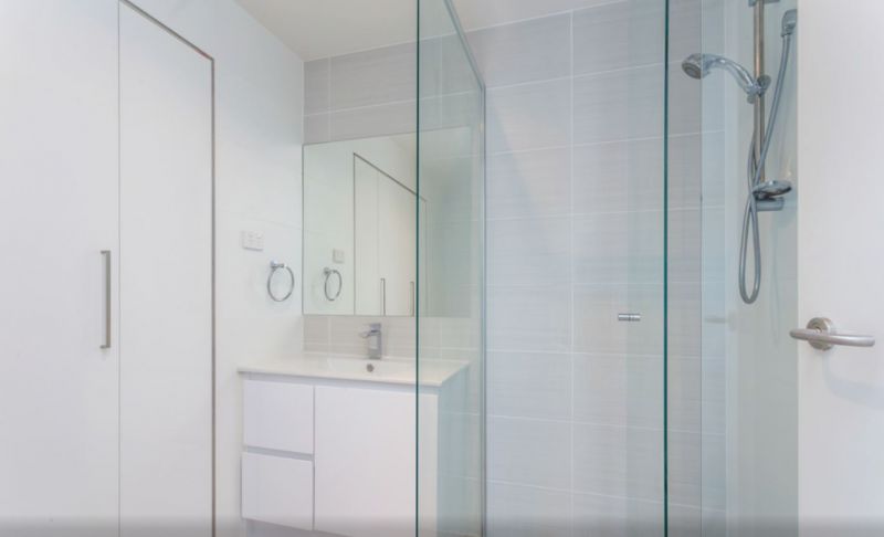 - Bathroom with floor-to-ceiling tiles, semi-frameless shower screens
